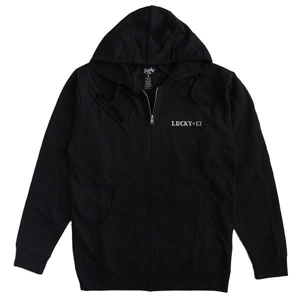 https://event.rakuten.co.jp/asuraku/about/ LUCKY13(ラッキーサーティーン) メンズ ジップアップ フードパーカー/スウェット 「The AMERICAN ORIGINAL Men's Full Zip Hooded」 1991年、南カリフォルニアの小さなガレージで友人数人とスタートし、現在もカスタムカルチャーの最前線で大人気のブランド、“LUCKY13(ラッキーサーティーン)” LUCKY13の存在感抜群のメンズZIPパーカー! お馴染みの人気デザインがバックにプリントされていてインパクト大♪