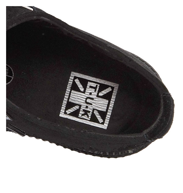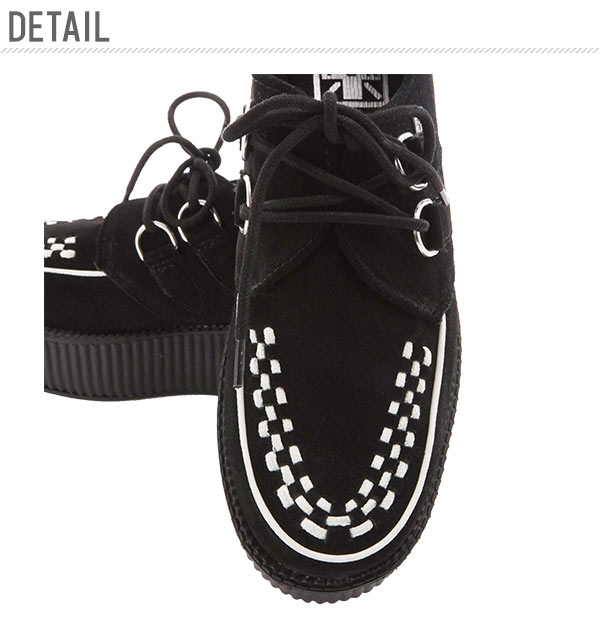 靴紐の穴は金属のリング、スカルとUKの国旗をモチーフとしたTUKのロゴが入るなど独特のテイストあふれる一足です。
