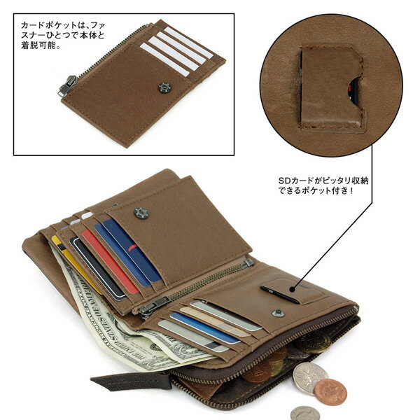DEVICE・デバイス:vintage調「2つ折り・長財布」レザーロングウォレット/脱着コインケース/本革/3カラー